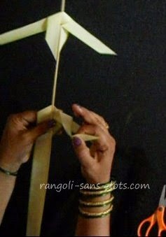 After bringing it around from behind the mid rib insert it in the part of the frond on the right that is folded on the left!. Pull both ends extending on both sides of the mid rib to get the completed element of the thoranam.