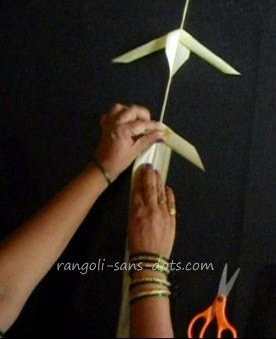 Now take the cut portion of the frond on the left to the right from behind the mid rib as shown in the image below. There should a reasonable distance between any two elements of the thoranam. This is to be decided based on the size of the element that is formed.